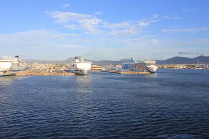 Einfahrt in den Hafen von Olbia. Hier liegen schon ein paar andere Fähren.